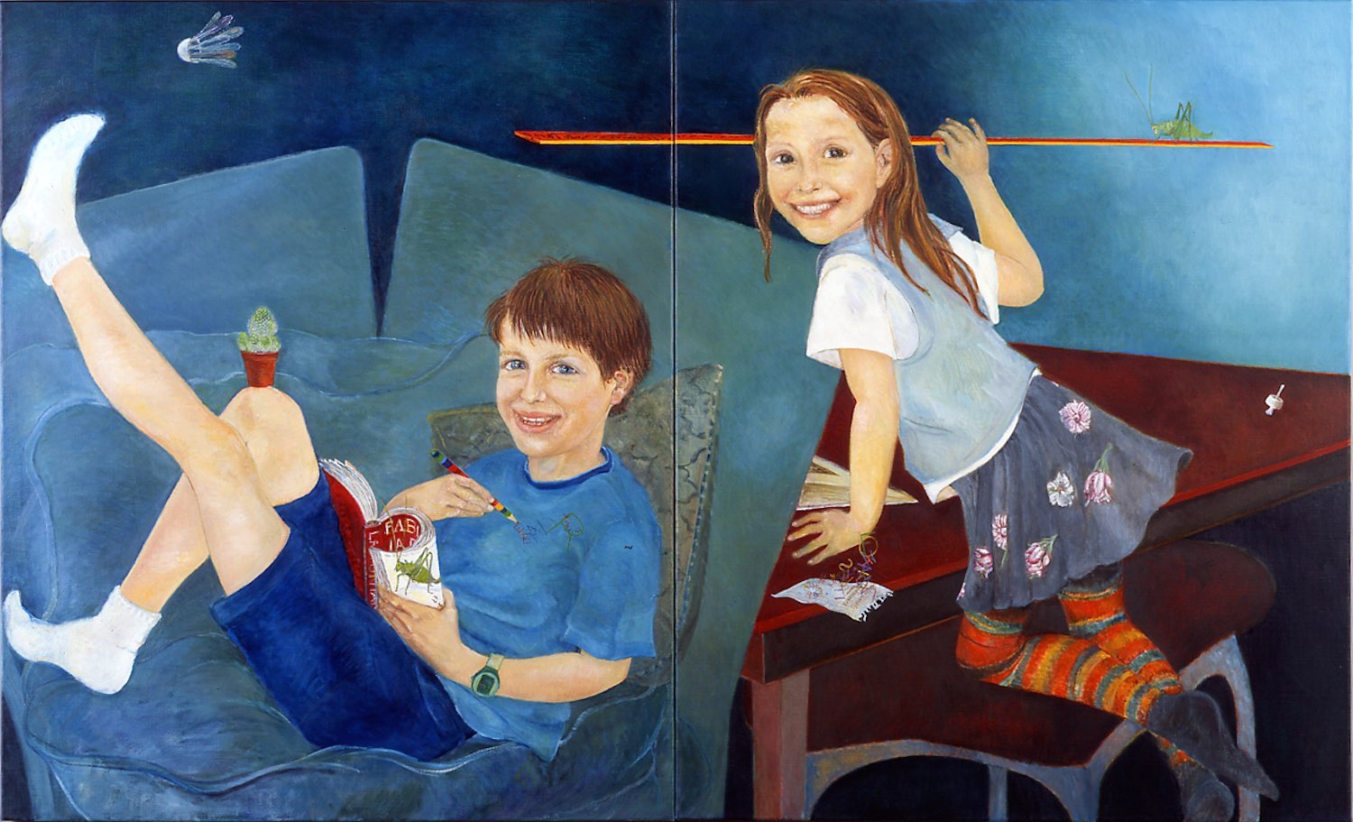 Eleanor and Rebecca are the daughters of an ecologist and a paintings conservator. Besides the obvious allusions to the fable of La Fontaine, the painting contains references to both the childrens’ interests and those of their parents. The commission contained the particular request that the painting should be a dyptich, viable as two separate portraits and yet, to be conceived as one.